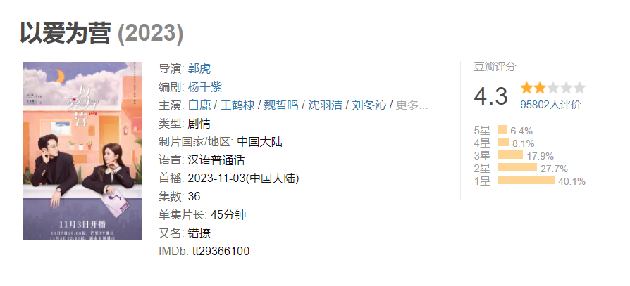 当今,《以爱为营》还是大结局,这部剧的评分仅获取4.3分,这系数不是两个当红演员互助后,应该获取的分数,看到这么的情况,有网友暗示:若是《以爱为营》的分数络续下落,这部剧确实和《我的东谈主间烟火》有一拼。